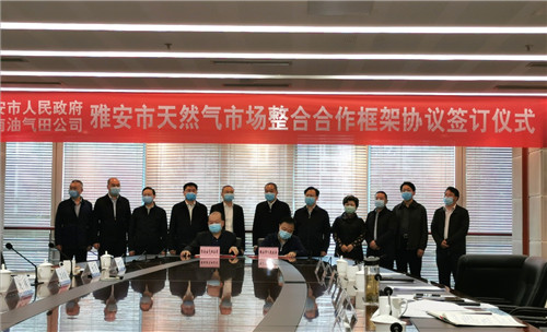 2020年4月20日,雅安市人民政府和西南油氣田公司雅安市天然氣市場整合合作框架協(xié)議簽約儀式在成都舉行。雅安市市委書記蘭開馳,市委副書記、市長鄒瑾,市委常委吳宏,市政府秘書長李陽軍,市政府副秘書長馮貴強,西南油氣田公司黨委書記、總經(jīng)理謝軍,黨委委員、副總經(jīng)理李寶軍,總經(jīng)理助理兼營銷部主任賀志明就推進雙方合作深入交流,并見證協(xié)議簽約。