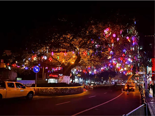 位于新民街、朝陽街、大北街路口幾處的雅安標(biāo)志性市樹黃葛樹上都安裝滿了大紅燈籠、滿天星彩燈和漂亮多彩的掛件,樹下綠化帶采用了麥穗和花朵造型的插地?zé)暨M(jìn)行點(diǎn)綴。黃色的麥穗燈光與大紅燈籠交相輝映,描繪出一幅歲物豐成的美好景象,讓廣大市民切身感受到了濃濃的年味。