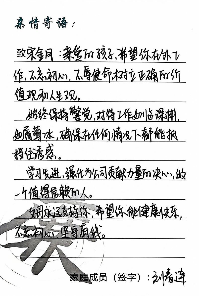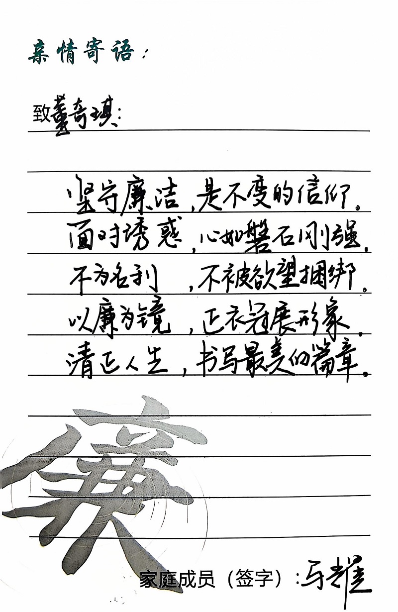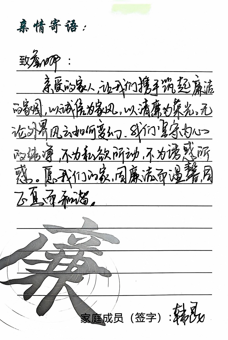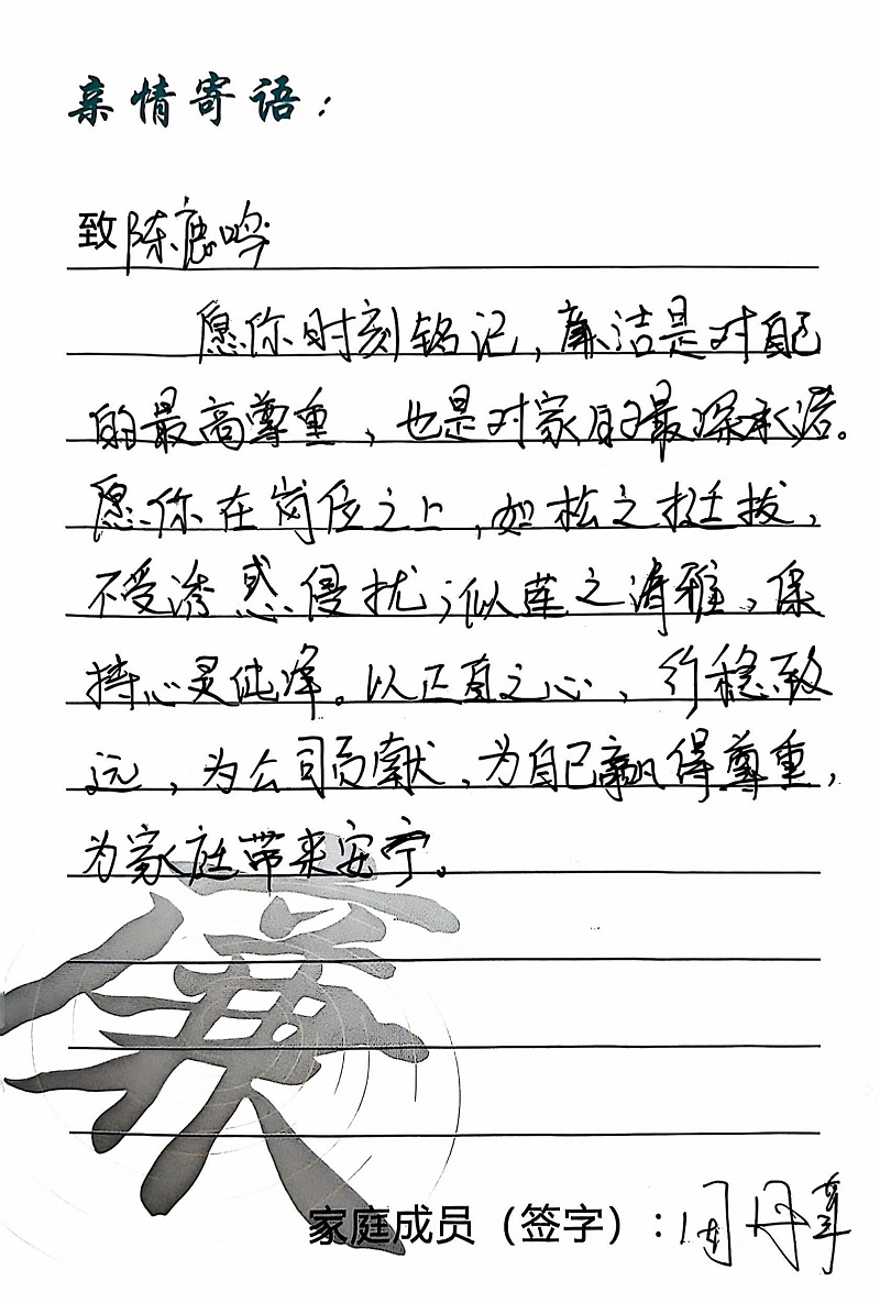 為深入學(xué)習(xí)黨的二十大精神,貫徹落實習(xí)近平總書記關(guān)于注重家庭家教家風(fēng)建設(shè)的重要論述,營造公司崇廉、尚廉、踐廉、助廉的良好氛圍,城投公司組織開展了“家滿清風(fēng)·廉潤城投”廉潔文化活動;顒娱_展以來,共征集廉政寄語210余條。經(jīng)各部門、子公司推薦,城投公司相關(guān)部門審核,評選出優(yōu)秀廉潔寄語43條,F(xiàn)將優(yōu)秀廉政寄語分批次進行展播,快來一起欣賞吧!