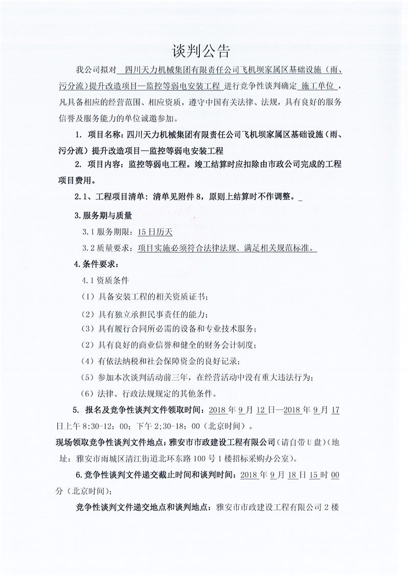 四川天力機(jī)械集團(tuán)有限責(zé)任公司飛機(jī)壩家屬區(qū)基礎(chǔ)設(shè)施(雨、污分流)提升改造項(xiàng)目——監(jiān)控等弱電安裝工程(競(jìng)爭(zhēng)性談判公告)