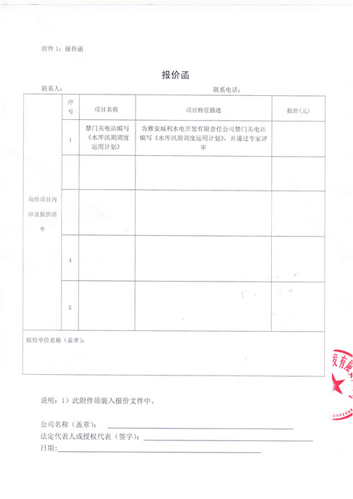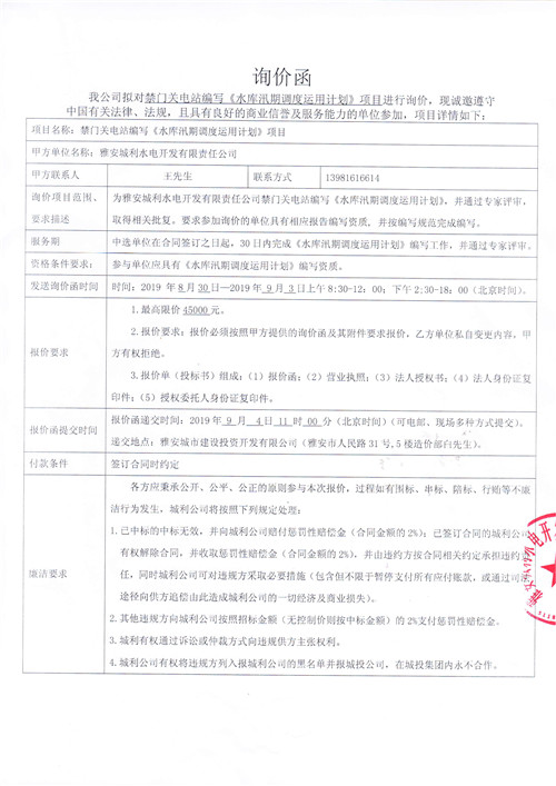 雅安城利水電開(kāi)發(fā)有限責(zé)任公司禁門(mén)關(guān)電站編寫(xiě)《水庫(kù)汛期調(diào)度運(yùn)用計(jì)劃》項(xiàng)目競(jìng)爭(zhēng)性談判公告