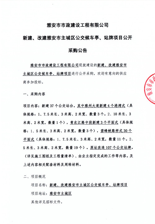 新建、改建雅安市主城區(qū)公交候車亭、站牌項(xiàng)目公開采購公告