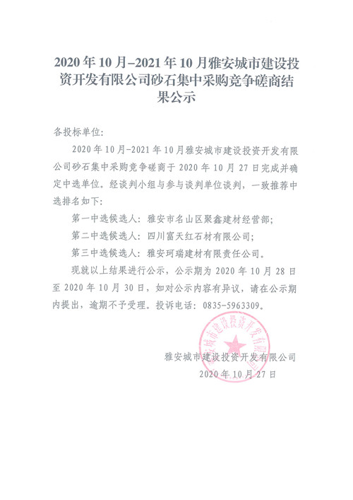 2020年10月-2021年10月雅安城市建設(shè)投資開(kāi)發(fā)有限公司砂石集中采購(gòu)競(jìng)爭(zhēng)磋商結(jié)果公示