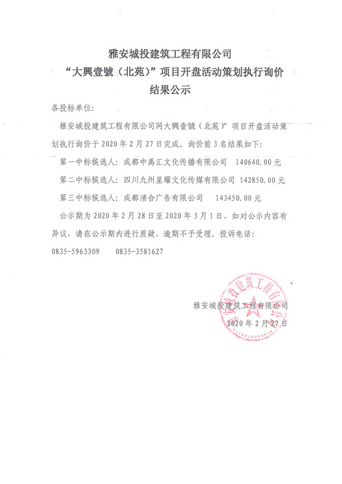 城投建工“大興壹號(北苑)”項(xiàng)目開盤活動策劃執(zhí)行詢價結(jié)果公示