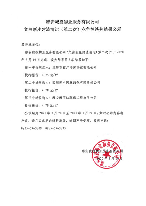 城投物業(yè)公司文曲新座建渣清運(yùn)(第二次)競(jìng)爭(zhēng)性談判結(jié)果公示