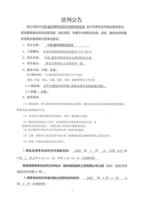 城投建工公司中國(guó)·藏茶博物館項(xiàng)目電梯采購(gòu)安裝競(jìng)爭(zhēng)性談判公告