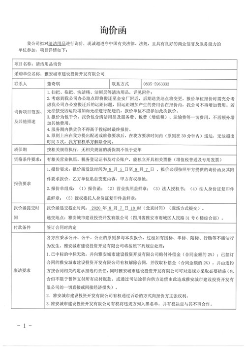 雅安城市建設投資開發(fā)有限公司清潔用品詢價函