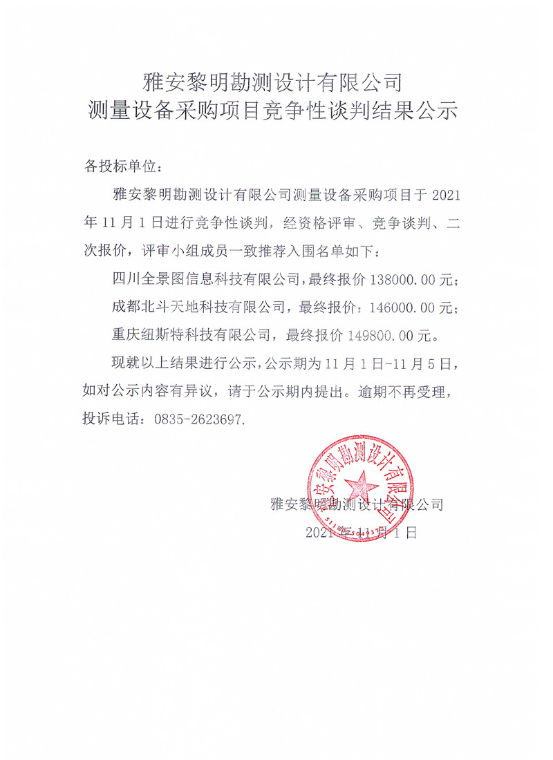 雅安黎明勘測設計有限公司測量設備采購競爭性談判結(jié)果公示