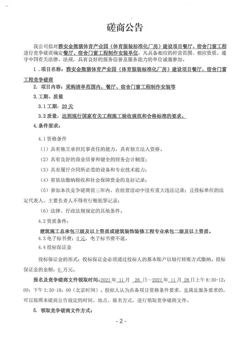 雅安金熊貓?bào)w育產(chǎn)業(yè)園(體育服裝標(biāo)準(zhǔn)化廠(chǎng)房)建設(shè)項(xiàng)目餐廳、宿舍門(mén)窗工程競(jìng)爭(zhēng)磋商公告