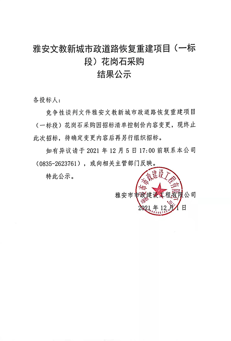 雅安文教新城市政道路恢復(fù)重建項(xiàng)目(一標(biāo)段)花崗石采購結(jié)果公示