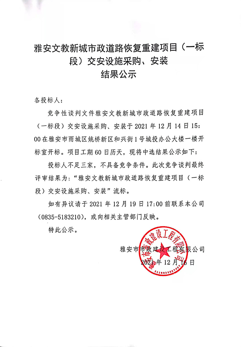 雅安文教新城市政道路恢復(fù)重建項目(一標(biāo)段)交安設(shè)施采購、安裝結(jié)果公示