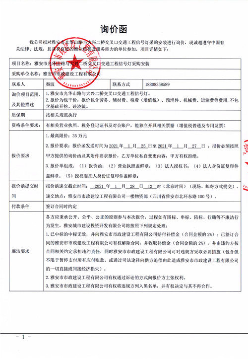 雅安市市政建設(shè)工程有限公司雅安市光華山路與大興二橋交叉口交通工程信號燈采購安裝詢價函