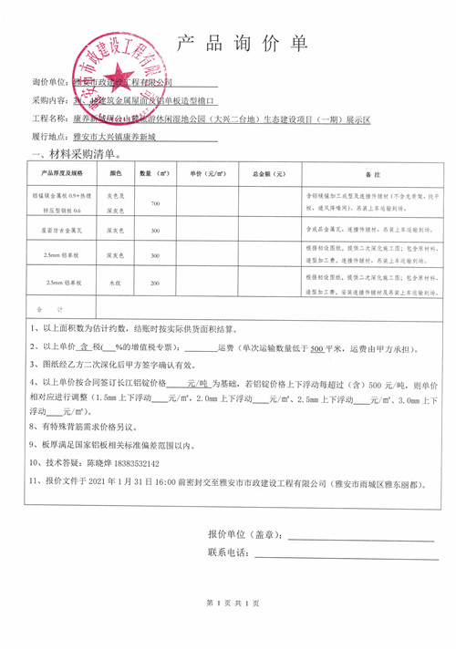 雅安市政建設(shè)工程有限公司康養(yǎng)新城周公山麓旅游休閑濕地公園(大興二臺地)生態(tài)建設(shè)項(xiàng)目(一期)展示區(qū)3#、4#建筑金屬屋面及鋁單板造型檐口產(chǎn)品詢價單