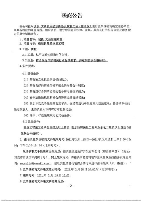 城投地產(chǎn)公司文曲新座樓頂拆除及恢復(fù)工程(第四次)競(jìng)爭(zhēng)性磋商公告