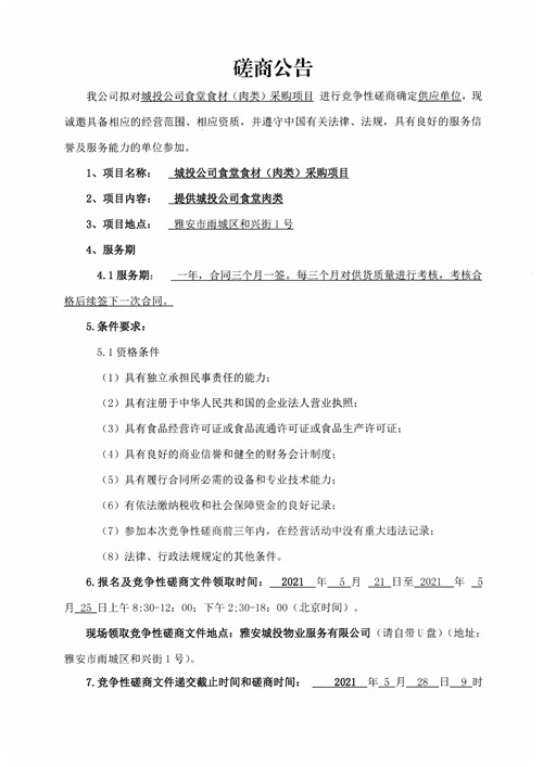 城投物業(yè)關(guān)于城投公司食堂食材(肉類)采購(gòu)項(xiàng)目競(jìng)爭(zhēng)性磋商公告