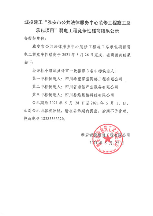 城投建工公司雅安市公共法律服務中心裝修工程施工總承包項目弱電工程競爭性磋商結(jié)果公示