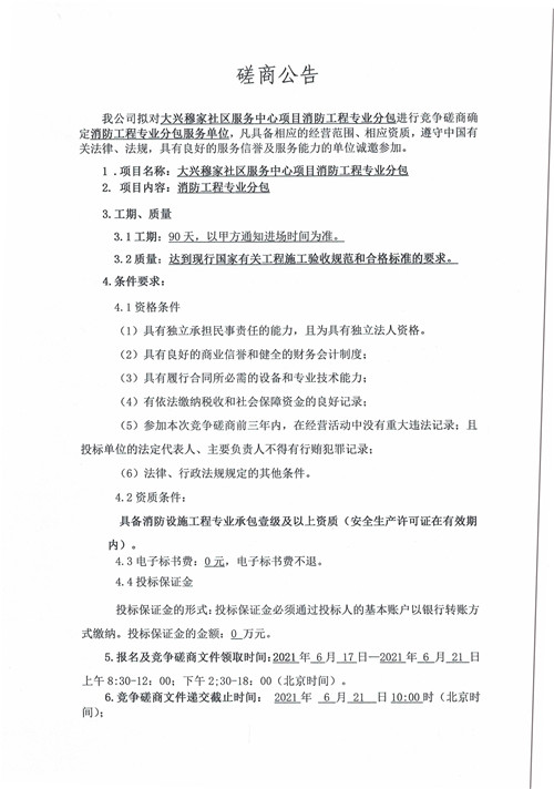 城投建工公司大興穆家社區(qū)服務中心項目消防工程專業(yè)分包競爭性磋商公告