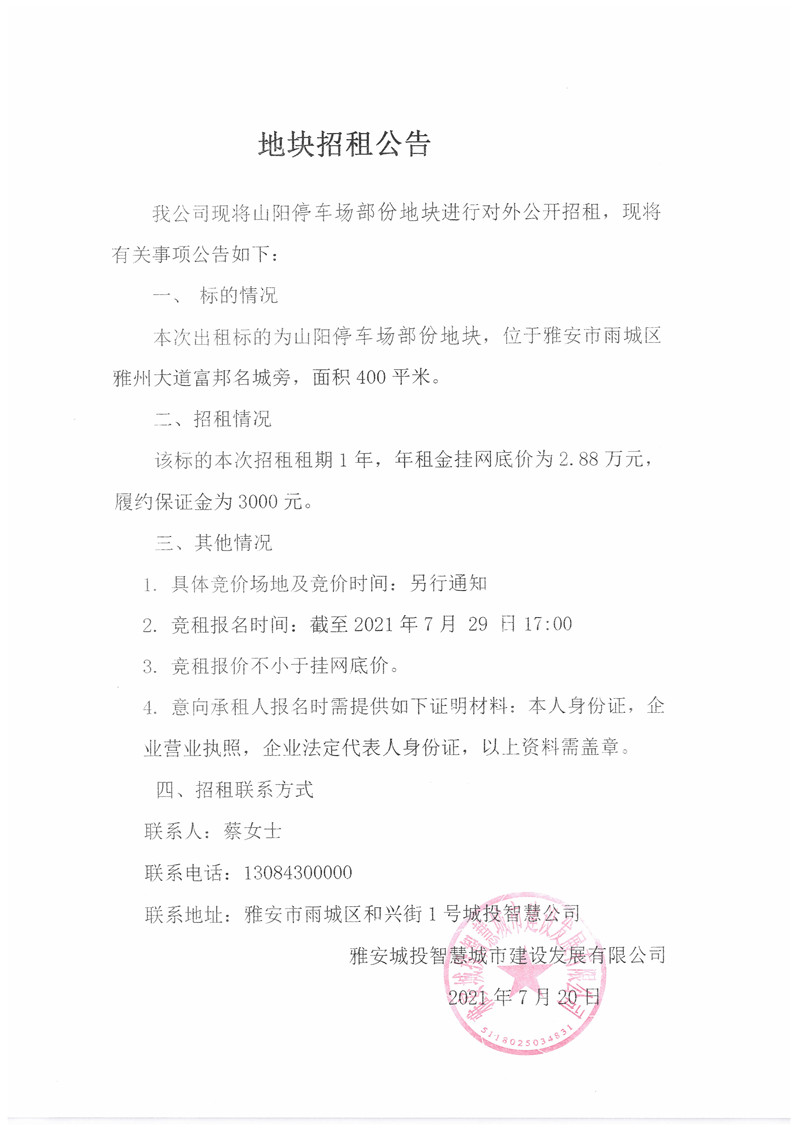 城投智慧公司山陽停車場部分地塊招租公告(400㎡)
