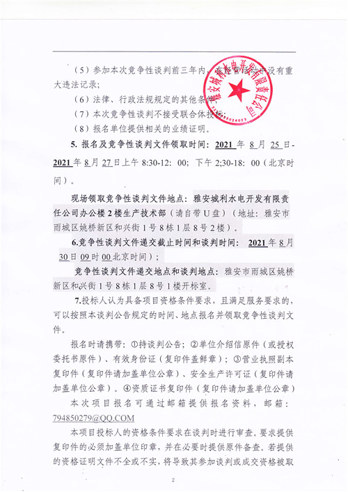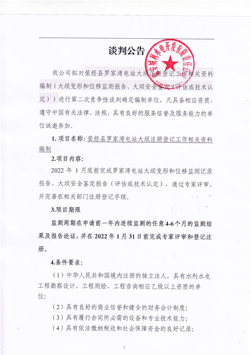 城利水電公司滎經(jīng)縣羅家灣電站大壩注冊登記工作相關資料編制競爭性談判公告(第二次)