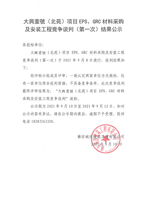 大興壹號(hào)(北苑)項(xiàng)目EPS、GRC材料采購(gòu)及安裝工程競(jìng)爭(zhēng)談判結(jié)果公示