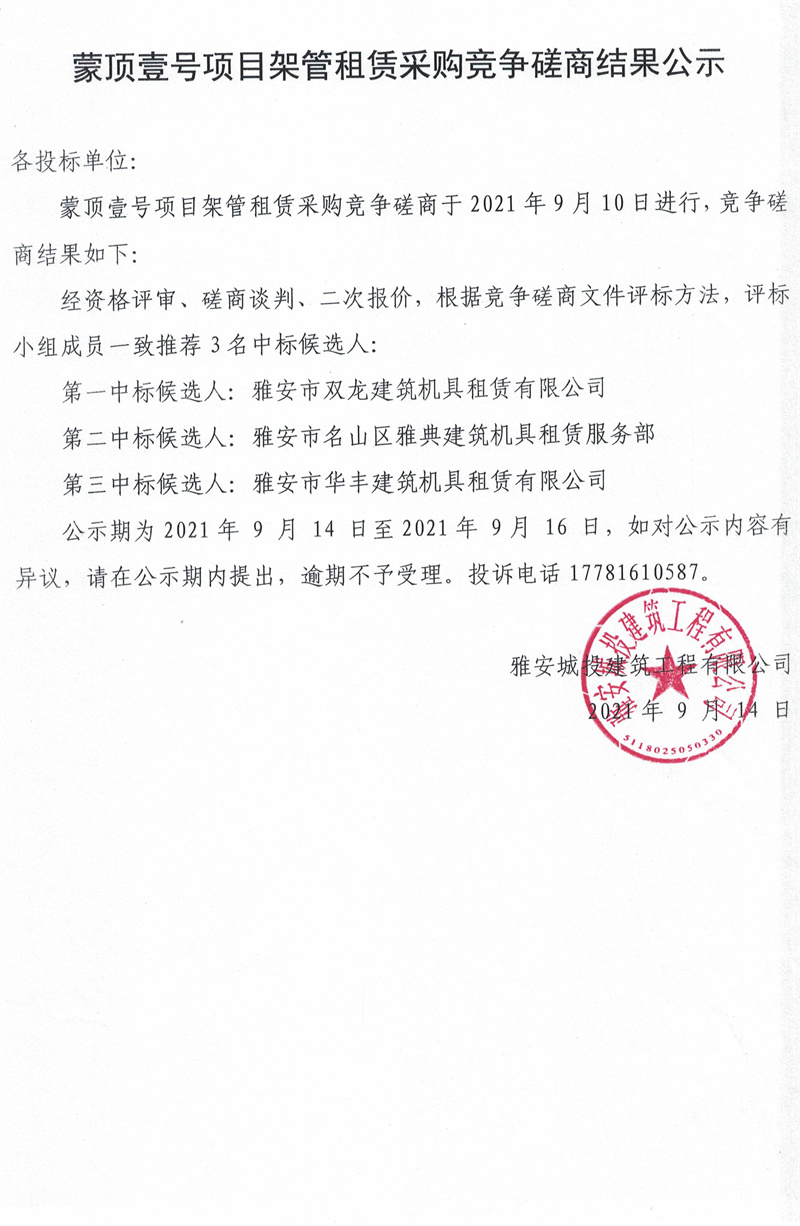 蒙頂壹號(hào)項(xiàng)目架管租賃采購(gòu)競(jìng)爭(zhēng)磋商結(jié)果公示