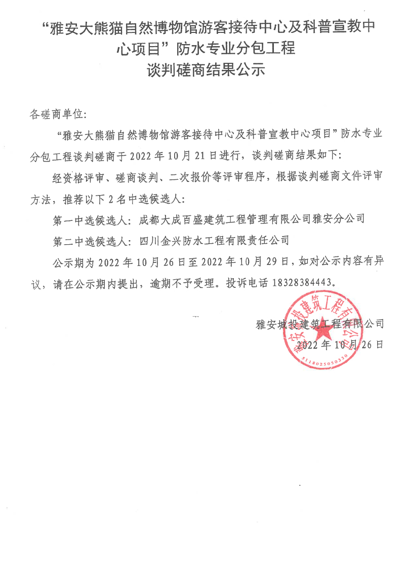 雅安大熊貓自然博物館游客接待中心及科普宣教中心項(xiàng)目防水專業(yè)分包工程談判磋商結(jié)果公示
