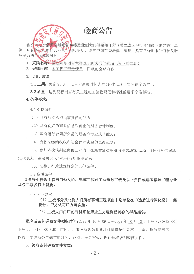 蒙頂壹號(hào)項(xiàng)目主樓及北側(cè)大門等幕墻工程(第二次)談判磋商公告