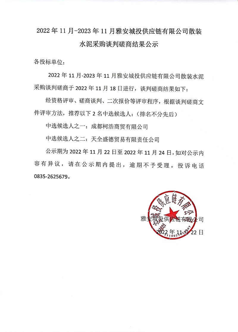 2022年11月-2023年11月雅安城投供應(yīng)鏈有限公司散裝水泥采購談判磋商結(jié)果公示