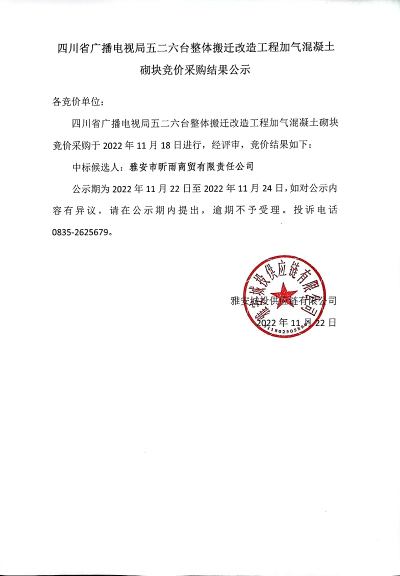 四川省廣播電視局五二六臺(tái)整體搬遷改造工程加氣混凝土砌塊競價(jià)采購結(jié)果公示