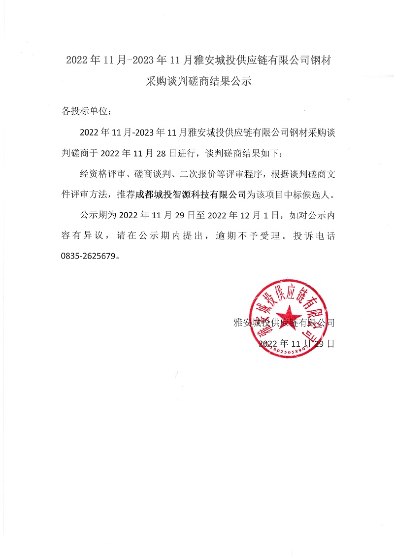 2022年11月-2023年11月雅安城投供應(yīng)鏈有限公司鋼材采購談判磋商結(jié)果公示