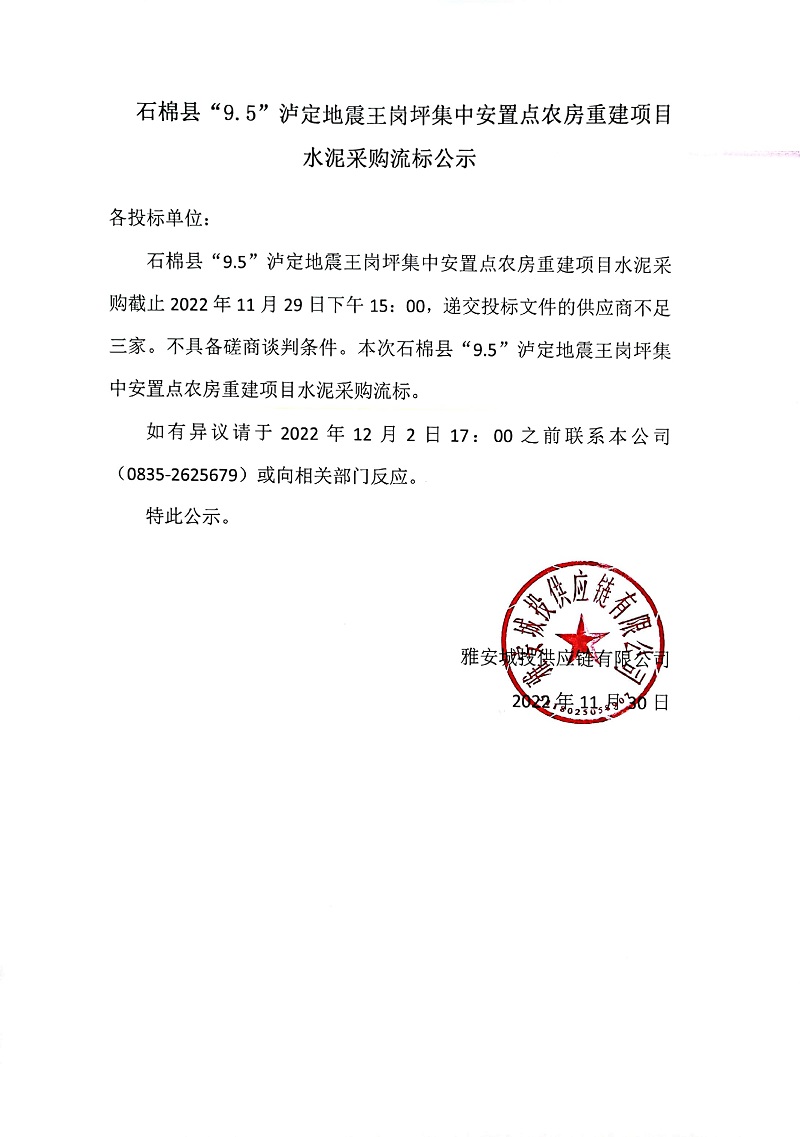 石棉縣“9.5”瀘定地震王崗坪集中安置點(diǎn)農(nóng)房重建項(xiàng)目水泥采購(gòu)流標(biāo)公示