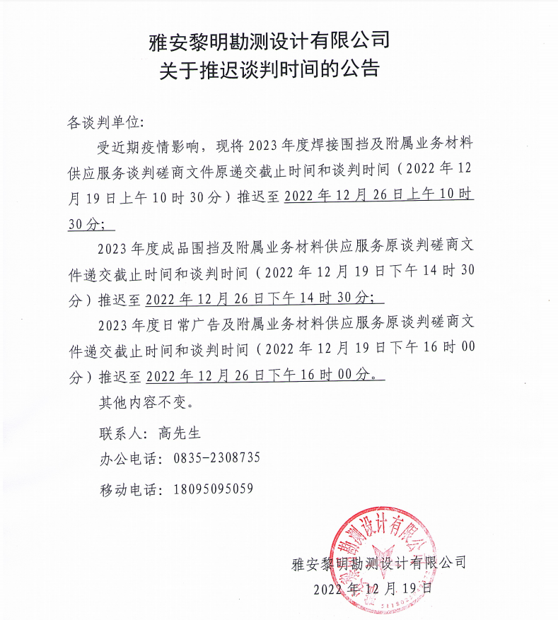 雅安黎明勘測(cè)設(shè)計(jì)有限公司關(guān)于推遲談判時(shí)間的公告