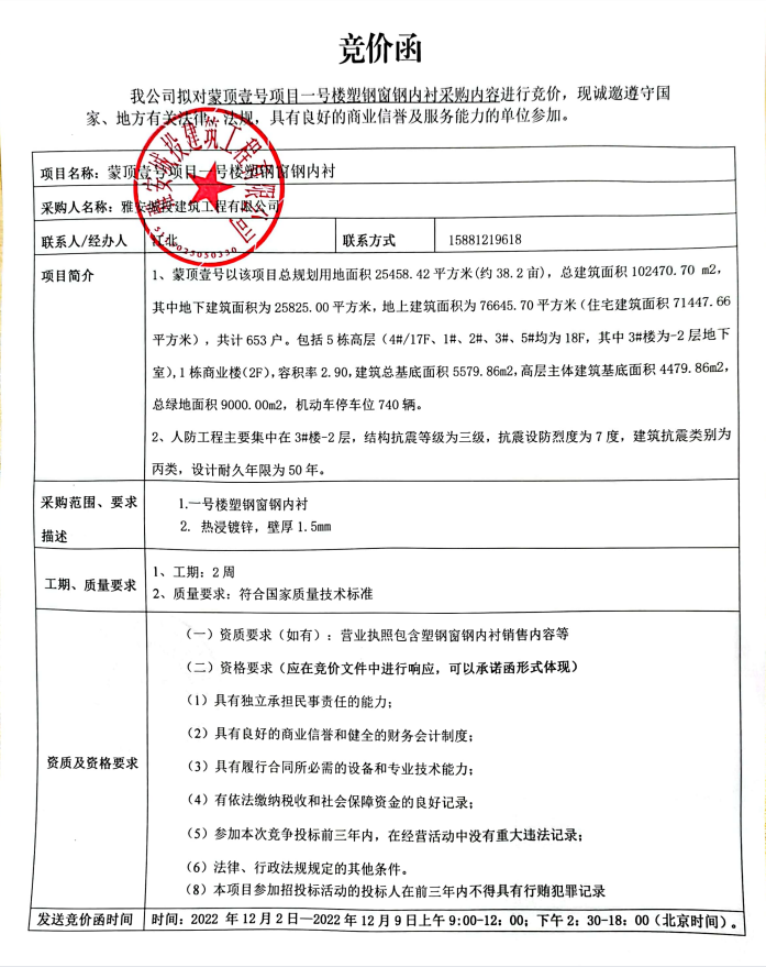 蒙頂壹號(hào)項(xiàng)目一號(hào)樓塑鋼窗鋼內(nèi)襯競(jìng)價(jià)公告