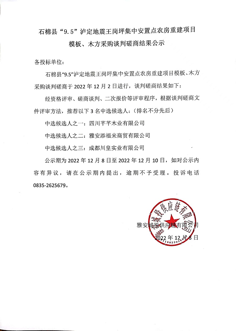 石棉縣“9.5”瀘定地震王崗坪集中安置點農(nóng)房重建項目模板、木方采購談判磋商結(jié)果公示