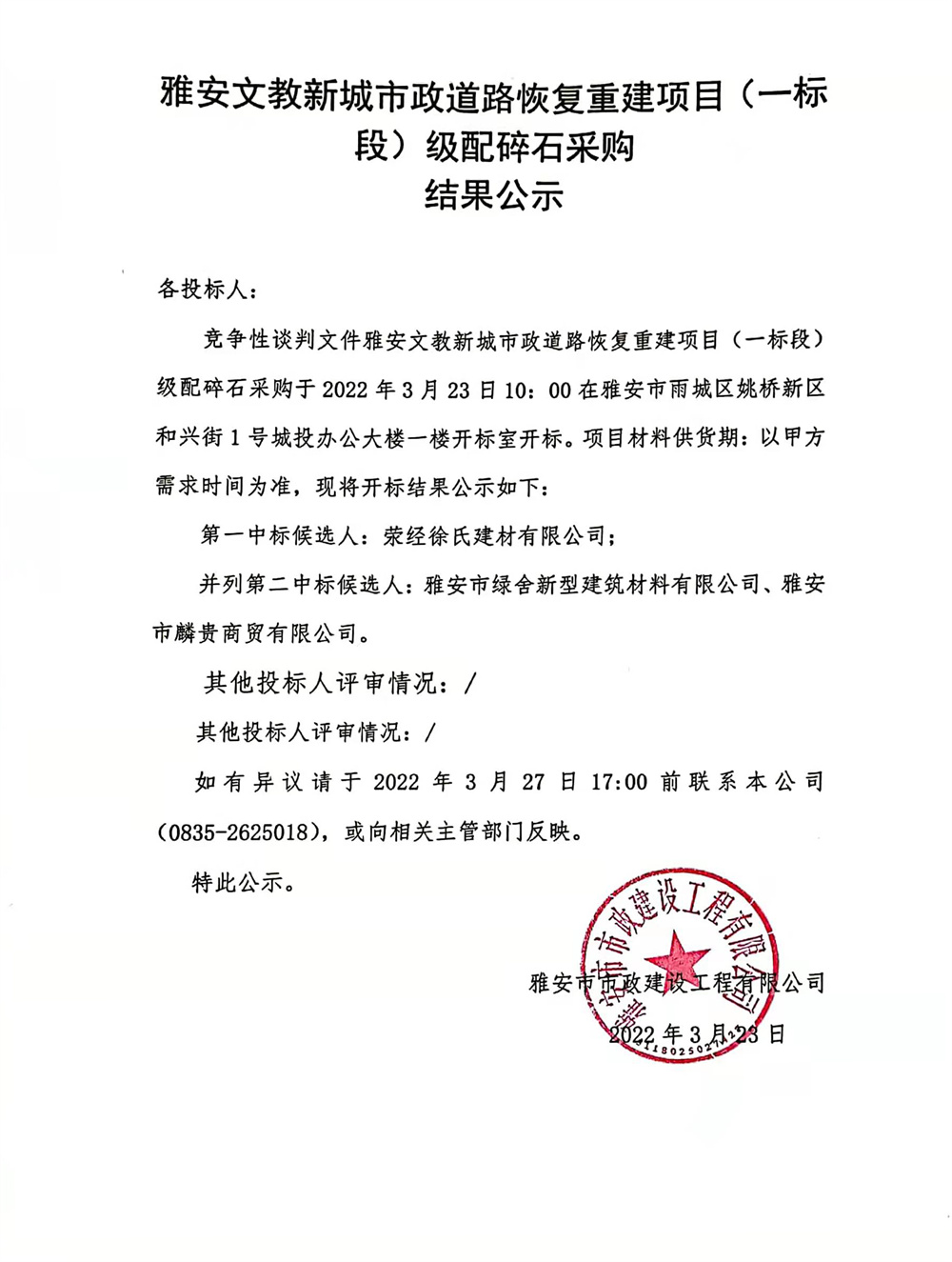 雅安文教新城市政道路恢復(fù)重建項目(一標段)級配碎石采購結(jié)果公示