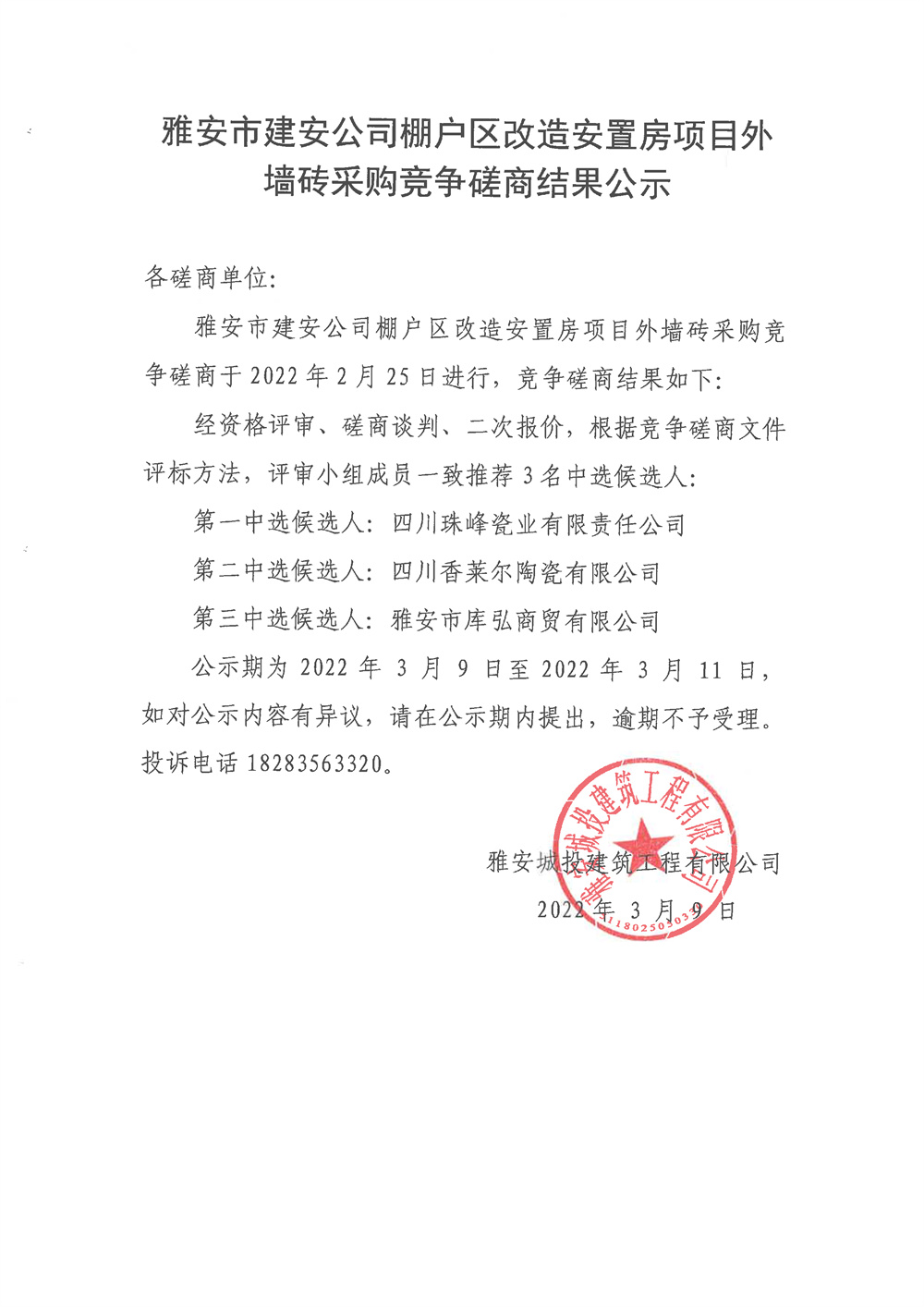 雅安市建安公司棚戶區(qū)改造安置房項目外墻磚采購競爭磋商結(jié)果公示
