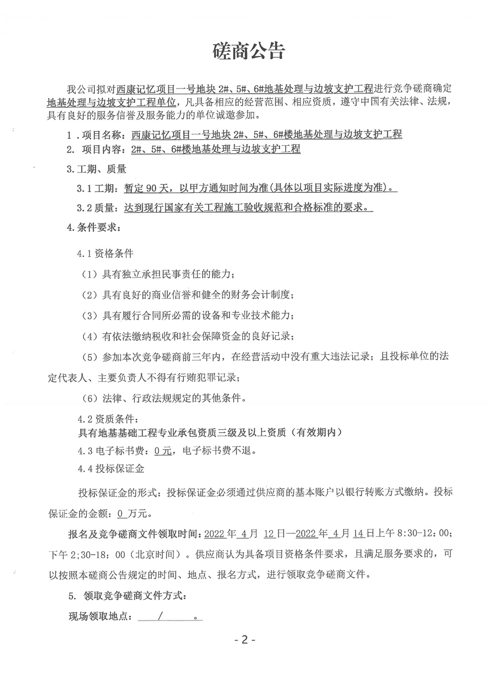 西康記憶項(xiàng)目一號(hào)地塊2#、5#、6#地基處理與邊坡支護(hù)工程磋商公告