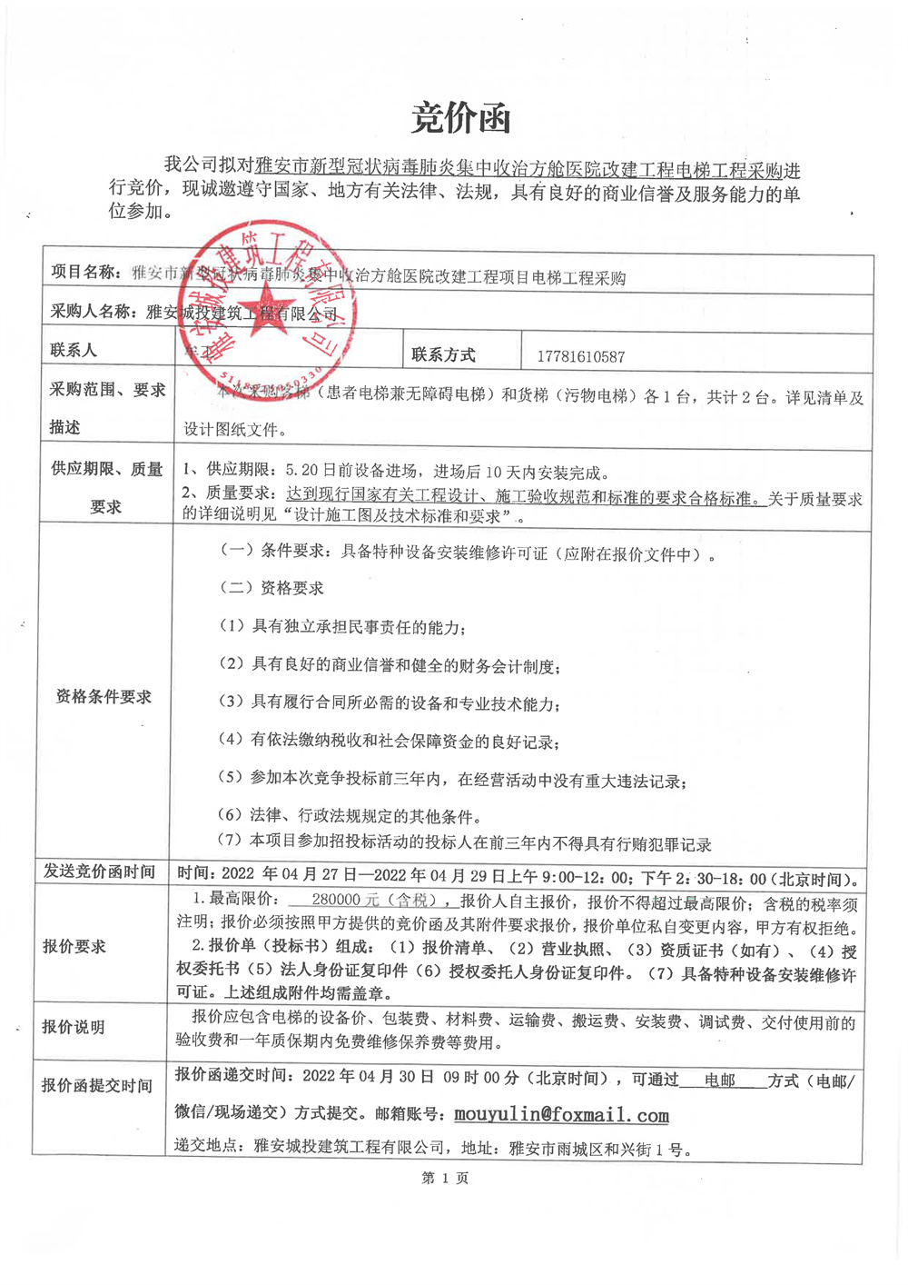 雅安市新型冠狀病毒肺炎集中收治方艙醫(yī)院改建工程項(xiàng)目電梯工程采購競價(jià)公告