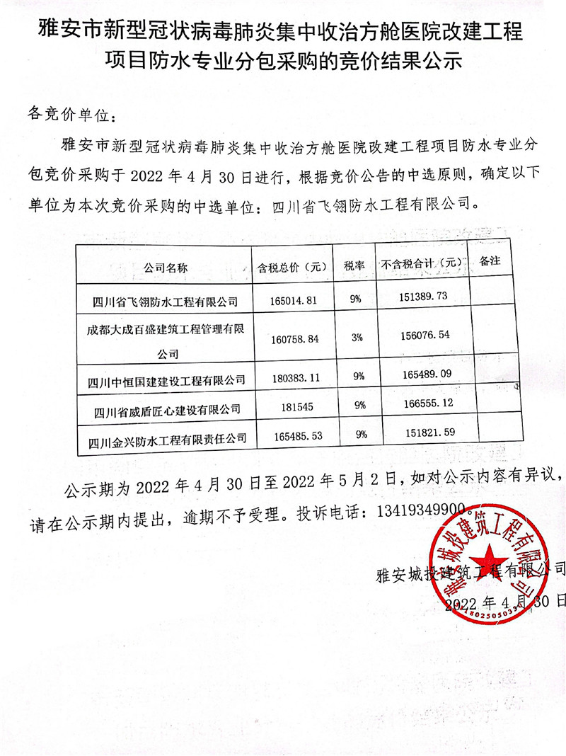 雅安市新型冠狀病毒肺炎集中收治方艙醫(yī)院改建工程項(xiàng)目防水專業(yè)分包采購(gòu)的競(jìng)價(jià)結(jié)果公示