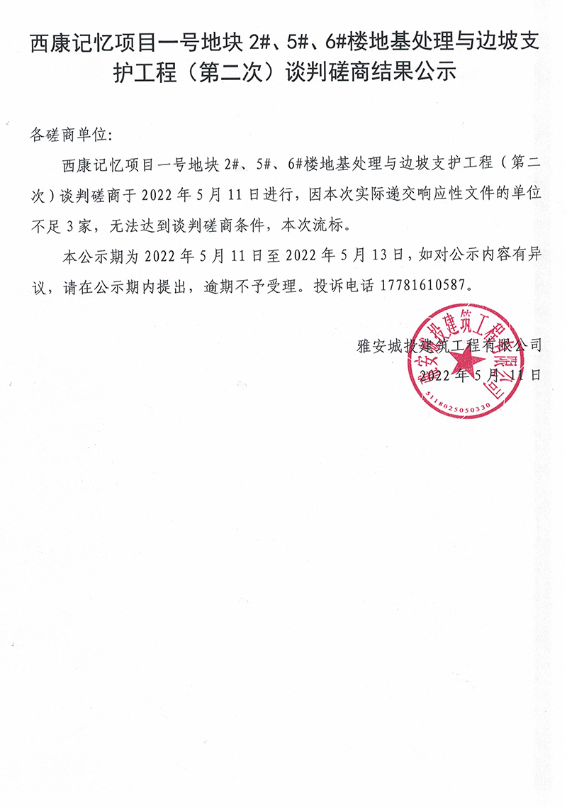 西康記憶項(xiàng)目一號(hào)地塊2#、5#、6#樓地基處理與邊坡支護(hù)工程(第二次)談判磋商結(jié)果公示