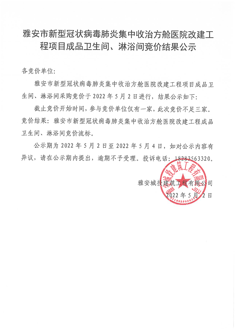 雅安市新型冠狀病毒肺炎集中收治方艙醫(yī)院改建工程項目成品衛(wèi)生間、淋浴間競價結(jié)果公示