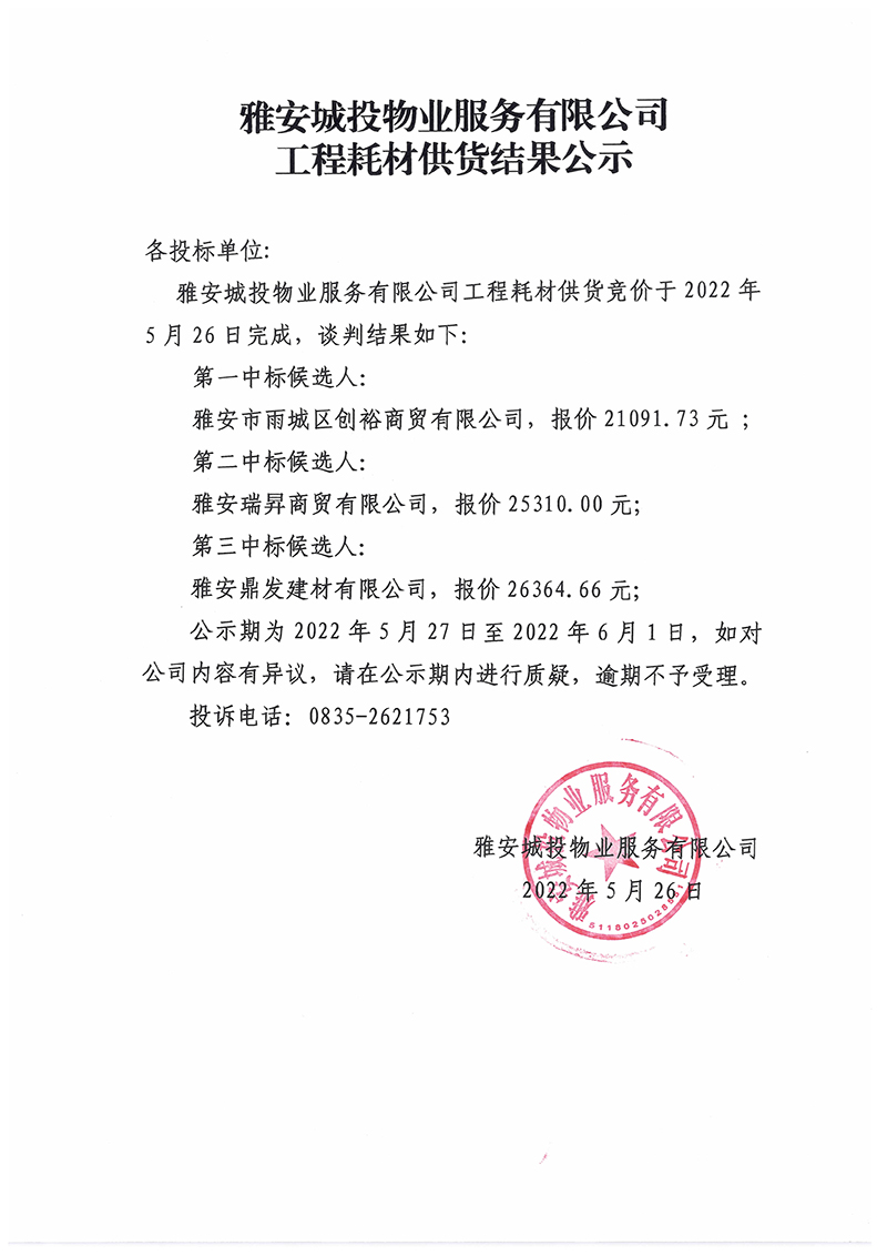 雅安城投物業(yè)服務(wù)有限公司工程耗材供貨結(jié)果公示