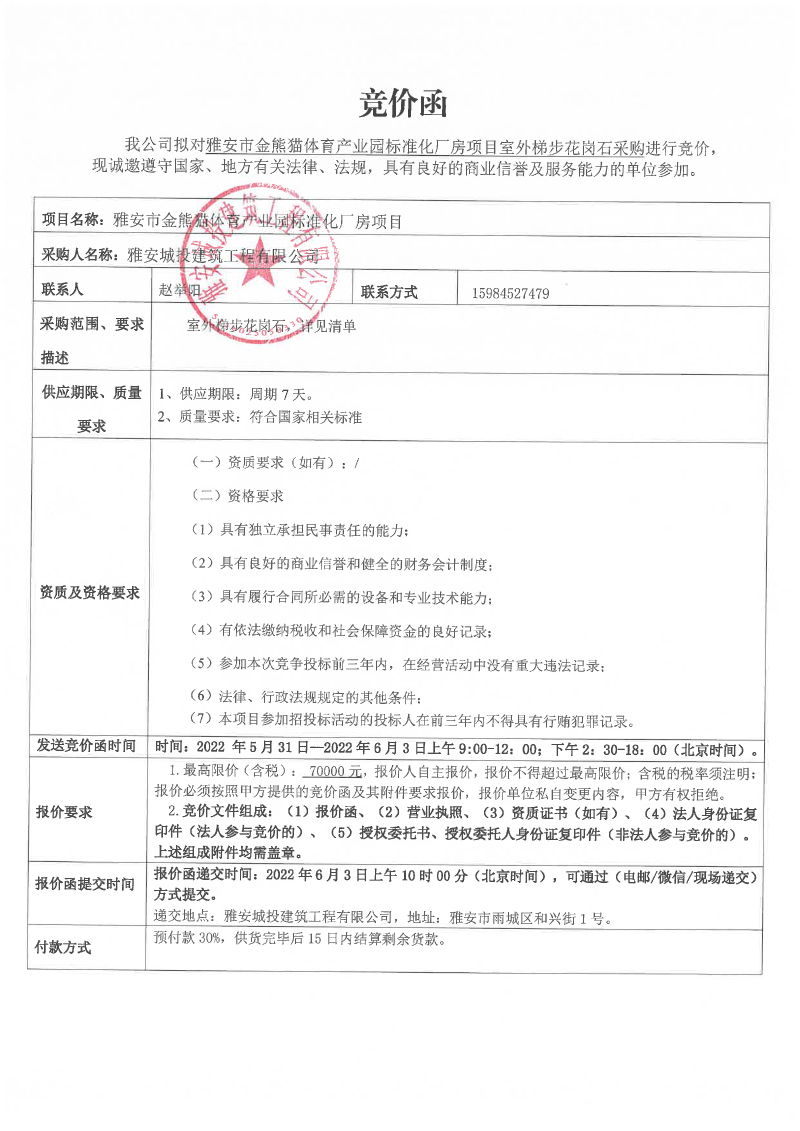 雅安市金熊貓體育產(chǎn)業(yè)園標(biāo)準(zhǔn)化廠房項目室外梯步花崗石采購競價函