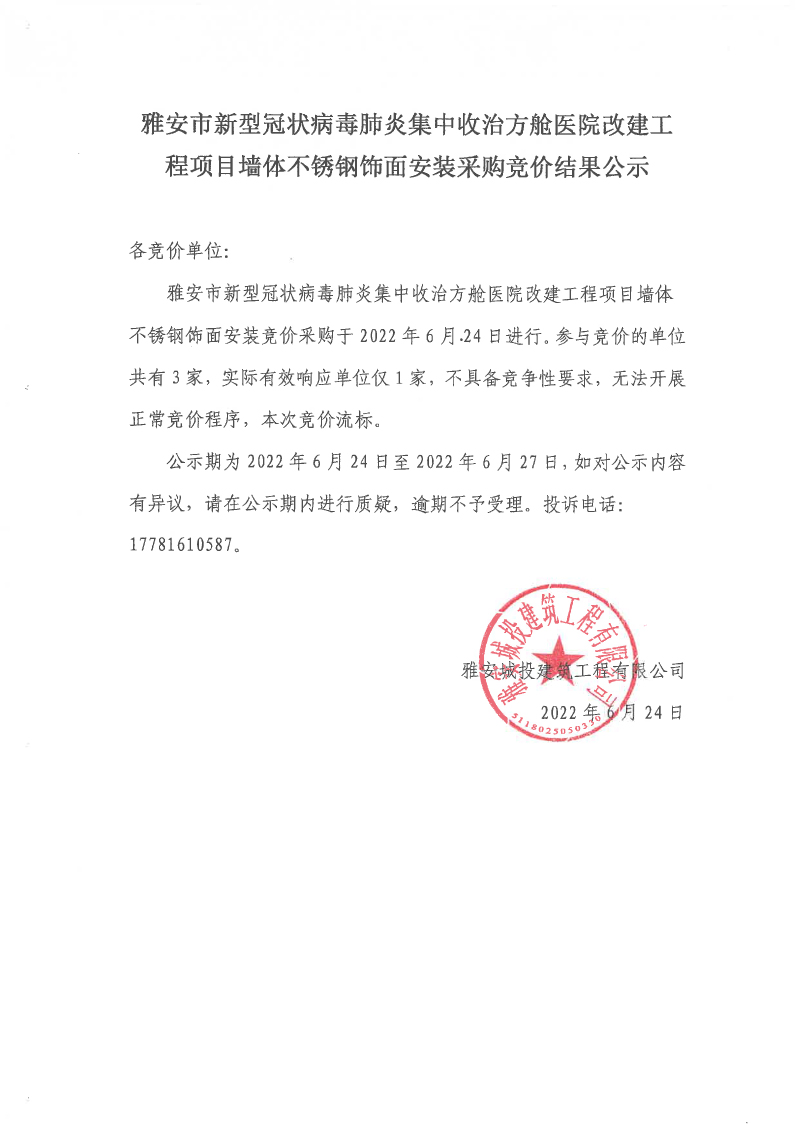 雅安市新型冠狀病毒肺炎集中收治方艙醫(yī)院改建工程項目墻體不銹鋼飾面安裝采購競價結(jié)果公示