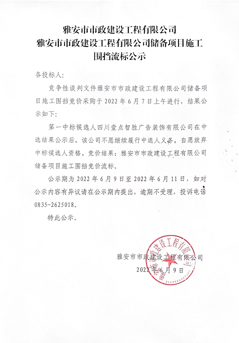 雅安市市政建設(shè)工程有限公司儲(chǔ)備項(xiàng)目施工圍擋流標(biāo)公示