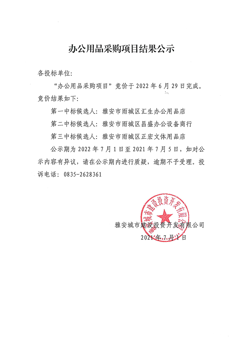 雅安城市建設投資開發(fā)有限公司辦公用品采購項目競價結(jié)果公示