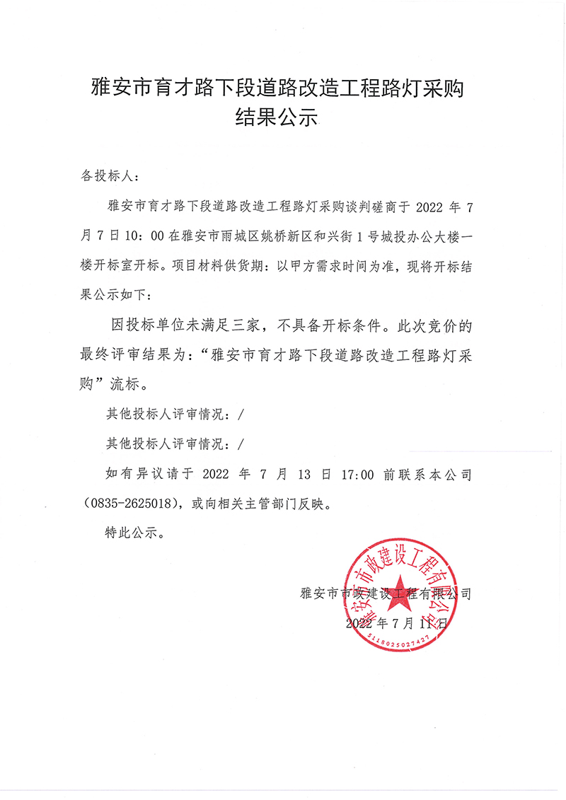 雅安市育才路下段道路改造工程路燈采購競價結(jié)果公示