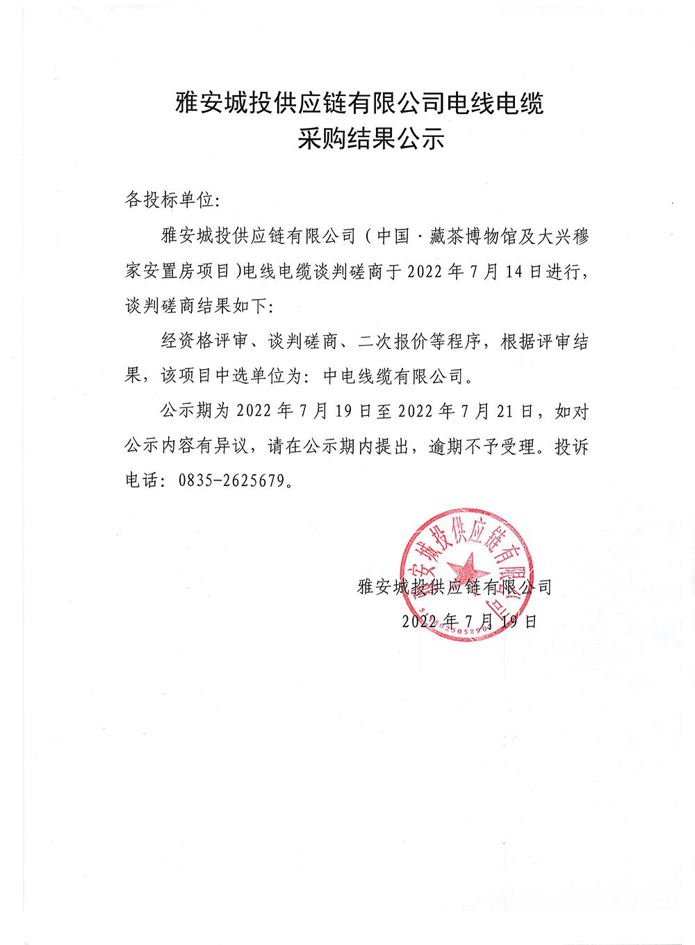 雅安城投供應鏈有限公司電線電纜采購結(jié)果公示