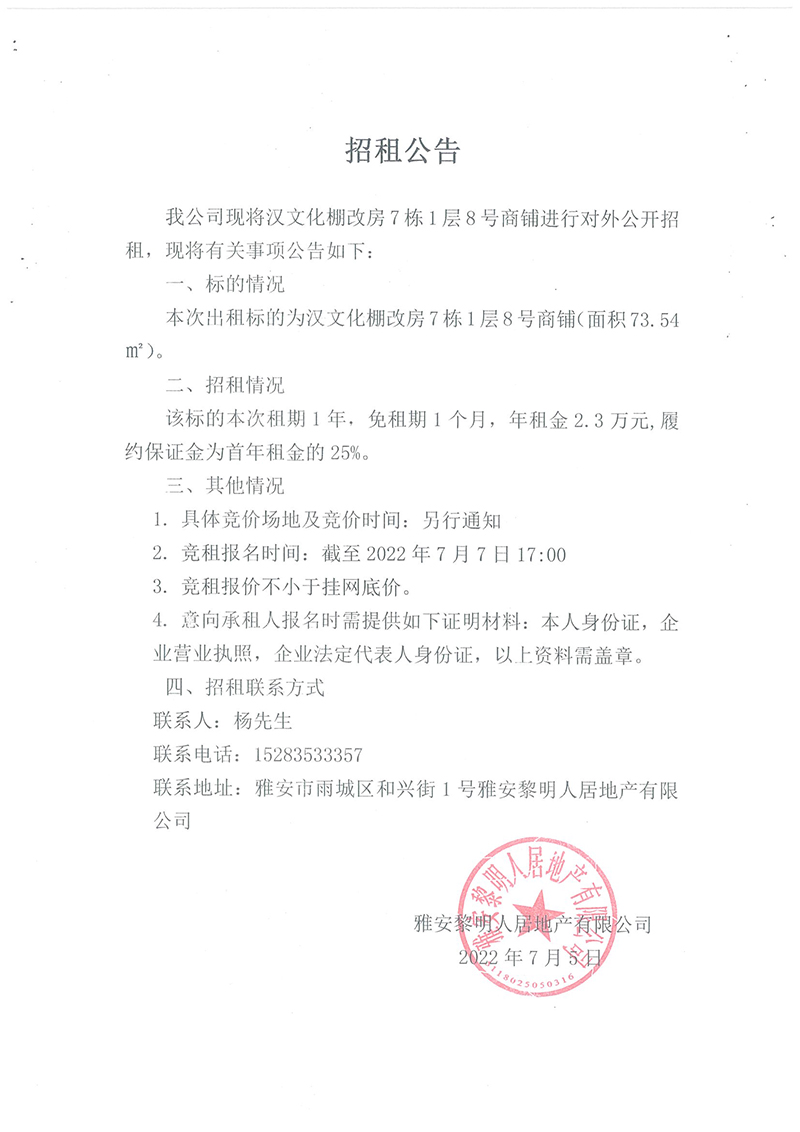 漢文化棚改房7幢1層8號商鋪對外招租公告