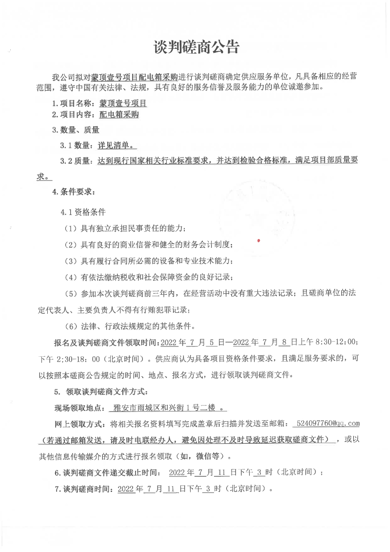 蒙頂壹號(hào)項(xiàng)目配電箱采購談判磋商公告